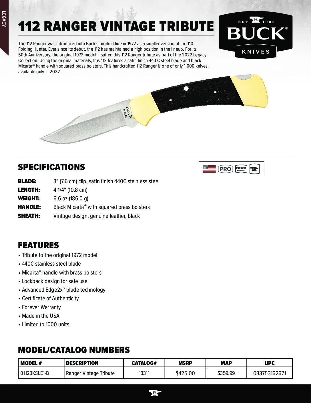 Buck Knives 112 Ranger 50th Anniversary Vintage Tribute Folding Knife, 440C Steel, Limited Edition