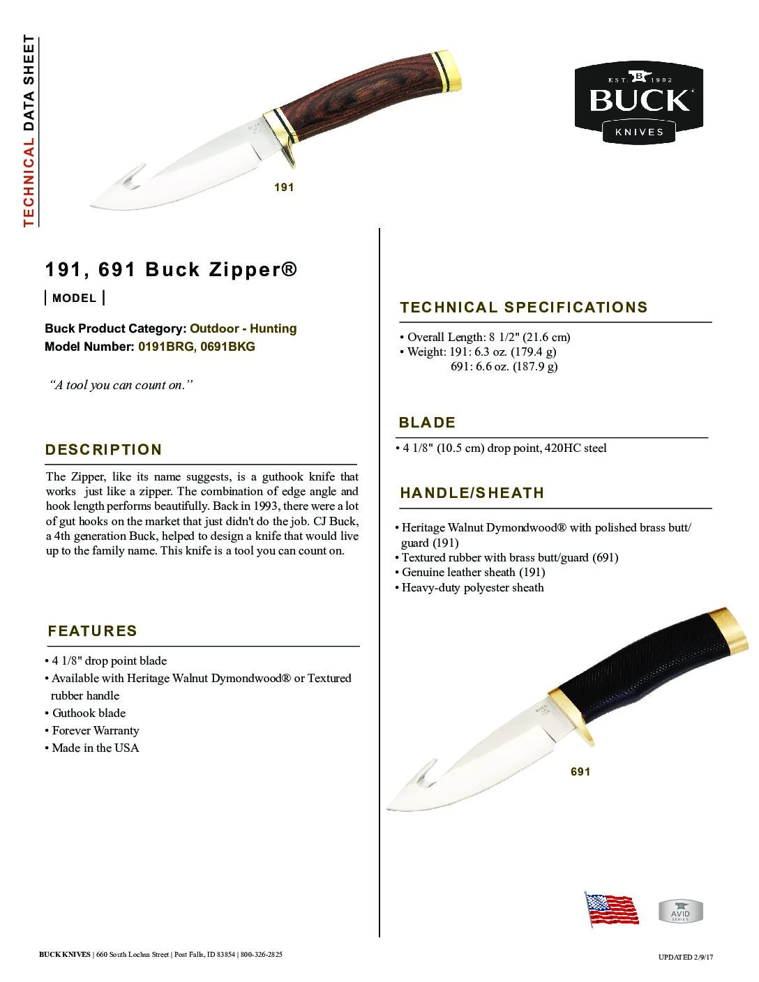 Buck Knives 191 Zipper Guthook Fixed Blade Knife W/ Sheath 0191BRG
